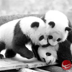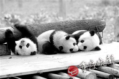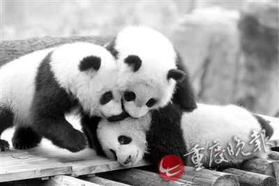 ▲龙凤胎大熊猫渝宝、渝贝(上面两个)个头比良月(最下面那个)大一点,毛色黑白分明。