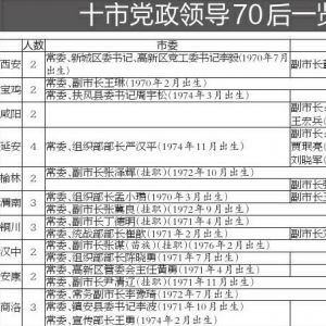 在国内地市换届中,湖北省出现了两名“80后”常委,这一现象在陕西十市换届中并未出现。华商报梳理发现,十市换届后100余名干部进入党委班子,近80名干部进入政府班子。其中,“70后”干部进入党政班子的总共有25人,其中党委班子16人,政府班子16人,其中7人在党政班子均有任职。延安市委常委、组织部部长严汉平去年任常委时42岁;汉中市委常委、副市长张谋(挂职)去年任常委时40岁。贾珉亮,1973年出生,今年2月任延安市副市长。