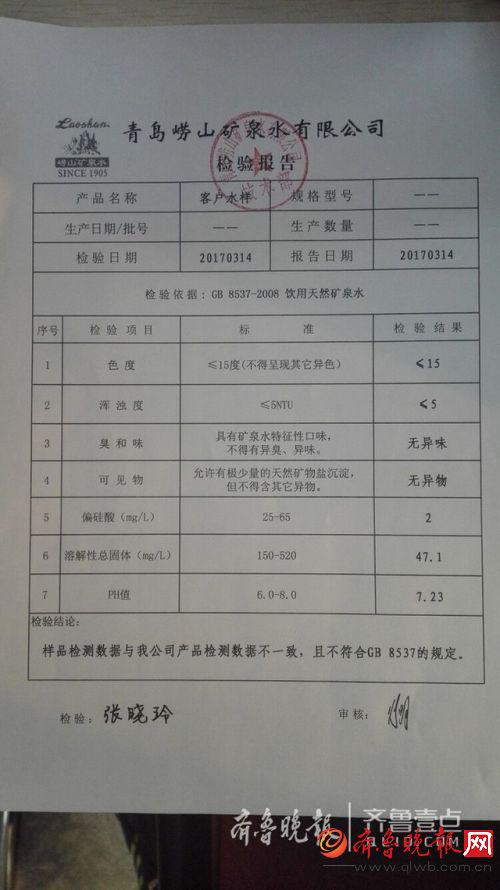 沙女士告诉记者,她从事咖啡行业培训工作十余年,对水质的具体要求有一定的经验。“我马上用自己常备的一款进口TDS水质检测笔进行了检测,数值为6,也就是说我订购的这桶崂矿并非真正的矿泉水,而是最接近纯水的水种。”沙女士说。随后,她拨打崂山矿泉水官方服务热线96656进行了反映。