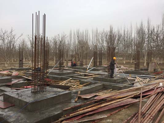 洛浦县纳瓦乡阿恰墩小学教学楼施工工地工人正在绑扎钢筋