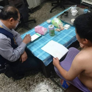 警察带男童回家发现家长不在,只好叫男童写下字条, 准备再带回派出所时男童父亲刚好回家。台湾《联合报》记者周宗祯/翻摄