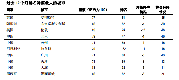 同时,北京和苏州两地的排名降幅最大,均下降16位,分别排名第47和第69位。