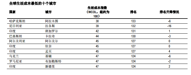 尼日利亚的拉各斯(132名)和哈萨克斯坦的阿拉木图(133名)的相对生活成本大幅下降,它们成为调查中生活成本最低的两个城市,值得注意的是,在全球生活成本最低的十个城市中,印度占了四席,分别是班加罗尔(131名)、钦奈(127名)、孟买(127名)以及新德里(124名)。
