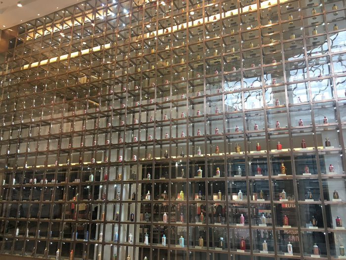 上图为名酒世界馆内景,388种不同设计的茅台酒瓶陈列。