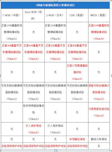说IIHS和NHTSA这两大测试机构更具代表性,一方面是因为他们所测试车型的种类和体量更具数据样本的说服力,另一方面也是因为他们的测试项目更细分化、测试条件更苛刻以及测试结果更具全面性。我们可以先来看看美国这两大测试机构与其它测试机构测试项目的对比。