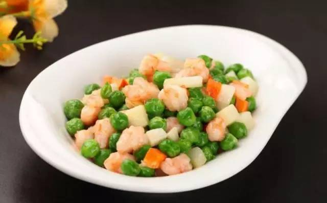 1、豌豆剥开,用水焯烫好盛出备用;北极虾去皮后,放入1克盐略微腌制。