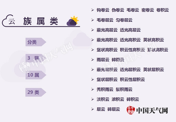看云这个动作说来简单,却也内藏乾坤。3族10属29类的云,数据帝数一半估计你就“扑街”了。不过呢,我还是愿意奉上一张高清无码彩图,供你自行研习,短则一日,长则半月,10种云到底孰高孰低、相貌如何,相信你定能如数家珍。