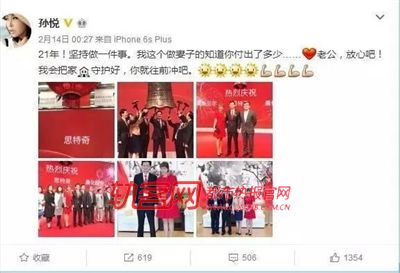 思特奇2月13日上市后,孙悦的微博在2月14日凌晨,发布一组照片,并发表“21年!坚持做一件事。我这个做妻子的知道你付出了多少……老公,放心吧!我会把家守护好,你就往前冲吧。”