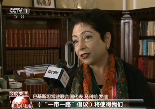 巴基斯坦常驻联合国代表 马利哈·罗迪:(“一带一路”倡议)将使得我们在经济上获益,并在政治上释放强烈信号,也就是应当为和谐和合作而努力,特别是经济合作,这是让人们更加繁荣更加幸福的途径。