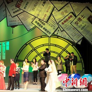该剧第一场“相亲角”,舞美以征婚启事和阳伞为主要元素,进行夸张化处理,层层交叠的视觉元素,力图表现出滑稽热闹的氛围。 潘索菲 摄