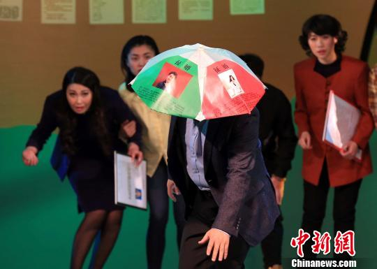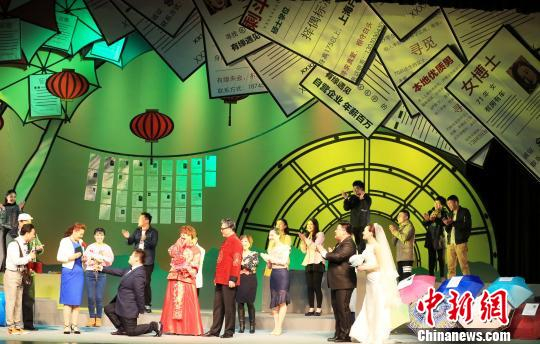 该剧第一场“相亲角”,演员头戴“相亲”阳伞出场。 潘索菲 摄