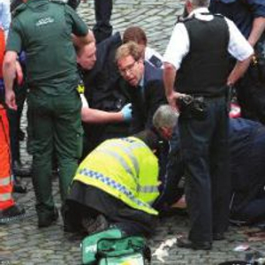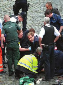 汽车驶过大桥在议会大厦附近撞到路边护栏停下,袭击者下车持刀追赶行人并试图进入议会大厦。袭击者手持刀具将一名没有武装的警员刺死,随后被警方开枪击毙。事发时,一名英国议员挺身而出为警察做急救,成为国民英雄。