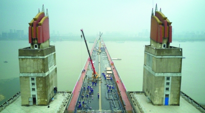 昨天,中铁大桥局的工人在长江大桥桥面进行棚架搭建。本报通讯员 赵赟 本报记者 徐琦摄