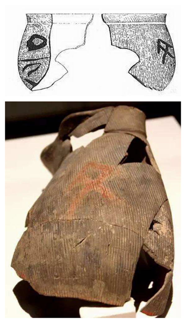 陶寺遗址出土陶扁壶,以及扁壶上的图案(上图)