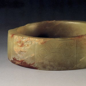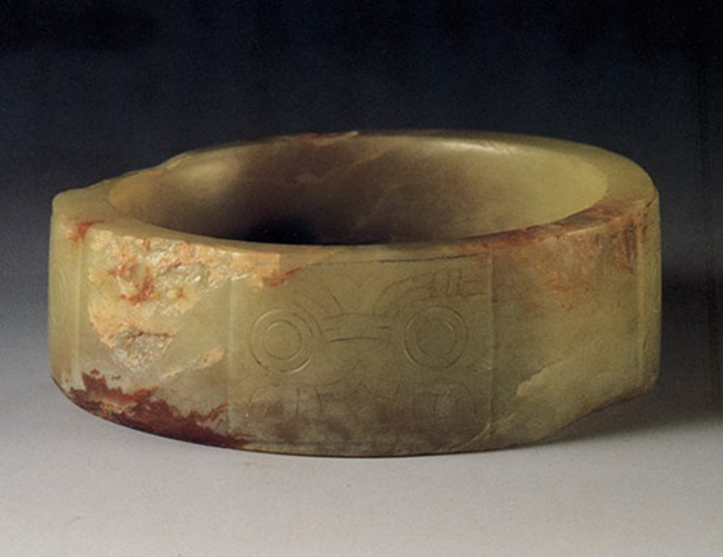 南京博物院藏良渚早期镯式玉琮,1977年吴县张陵山出土,琮上纹饰为目前所见最早兽面纹。