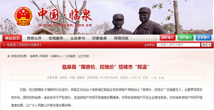 3月23日,安徽省阜阳市临泉县政府官网突然发布一则“临泉县限房价、控地价给楼市降温”通告。
