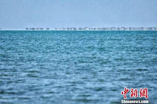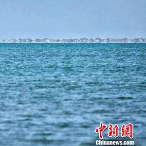 甘肃敦煌盐碱荒滩现碧波湖面 引民众戈壁“看海”
