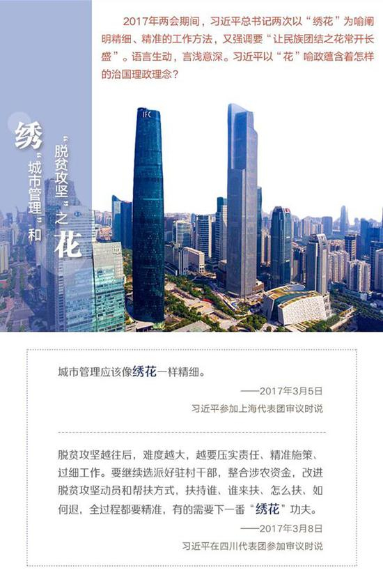 二绣脱贫攻坚:“全过程都要精准,有的需要下一番‘绣花’功夫。”3月8日,习近平在四川代表团谈脱贫攻坚,再次以“绣花”为喻。