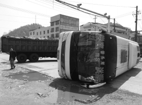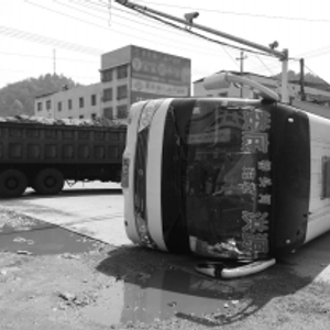 大货车撞上中巴,造成中巴车侧翻,3人骨折,8人受伤。这起本来应打上感叹号的车祸,因为附近一辆路政执法车的出现,而打上了问号。