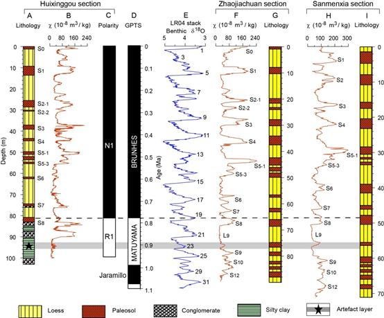 中国科学院地球环境研究所研究员敖红联合国内外同行,对三门峡阿舍利的年代进行了详细研究。研究剖面厚103米,由上部的黄土序列和下部的河流相地层组成,遗址层位在剖面的92~95米。磁化率和岩性结果表明上部的黄土序列包括了S0–S8,地层连续完整,没有缺失(图2)。古地磁结果表明该剖面记录了布容正极性时和松山负极性时上部的沉积,布容-松山极性界限位于L8底部,阿舍利文化层位于布容-松山极性界限以下~8米的灰绿色粉砂质粘土中,年代约0.9 Ma,对应深海氧同位素23阶段。因此,三门峡遗址出土的阿舍利石器比百色盆地的阿舍利石器早了约10万年,成为东亚中纬度地区早更新世晚期的阿舍利文化代表。这一研究对于理解中国北方旧石器文化面貌的复杂多样,探讨欧亚大陆早期人类迁徙和阿舍利技术的传播过程提供了重要参照。
