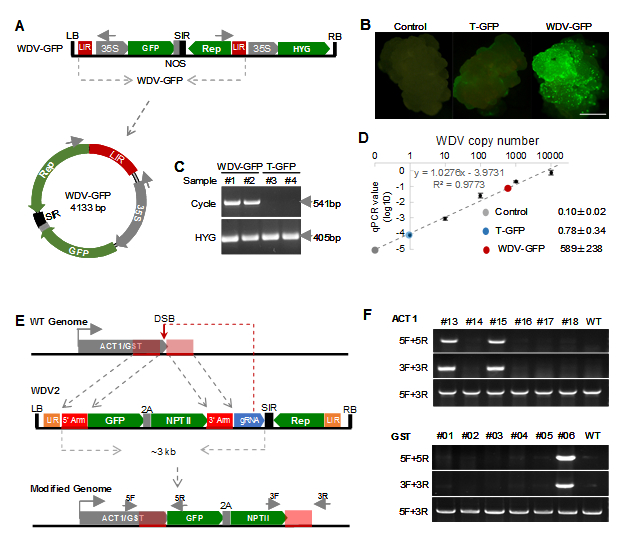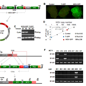 朱健康研究组改造了Geminivirus中的一个成员——小麦矮缩病毒(wheat dwarf virus, WDV),在水稻愈伤组织中的测试发现其提供供体分子的数量是传统T-DNA的数百倍。该研究进一步把CRISPR/Cas9系统和WDV系统整合,辅以定向筛选的方式,对水稻内源的ACT1和GST位点定点插入GFP标记,对转化植株的鉴定表明外源基因定向敲入的效率最高可达到19%。该研究提供了一种在植物基因组中简单高效地实现同源重组或外源片段定点敲入的方法,将在基因功能研究和作物精细育种中发挥重要作用。