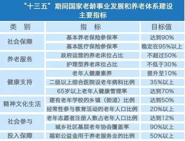《规划》立足于我国“未富先老”的现实,提出了4个方面的目标、设置了8个方面的主要任务:多支柱、全覆盖、更加公平、更可持续的社会保障体系更加完善,居家为基础、社区为依托、机构为补充、医养相结合的养老服务体系更加健全,有利于政府和市场作用充分发挥的制度体系更加完备,支持老龄事业发展和养老体系建设的社会环境更加友好等四项发展目标,以及健全完善社会保障体系、健全养老服务体系、健全健康支持体系、繁荣老年消费市场、推进老年宜居环境建设、丰富老年人精神文化生活、扩大老年人社会参与、保障老年人合法权益等八大重点任务。