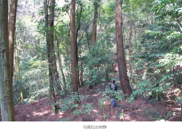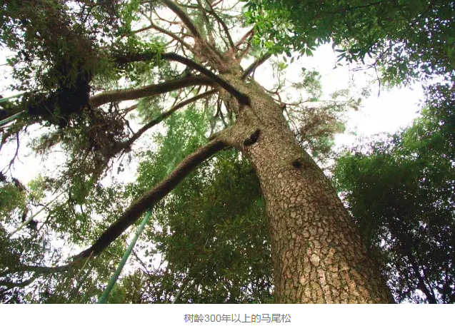 据初步测算,马尾松古树群平均树高超过20米,平均树龄在150年左右。其中的一株树龄在300年以上, 高达45米,相当于15 层楼房高。