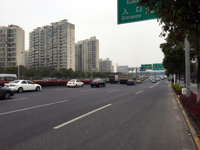 这段杨高南路从左至右共5车道,中环线的上匝道口设在最右侧的第5车道上。原来,从三林路的两条左转道拐进杨高南路后,车辆通常位于道路左侧的第1根、第2根车道。而要上中环,司机们完成左转后,必须尽快变道到最右侧的第4车道、第5车道,否则很快就会错过上匝道。
