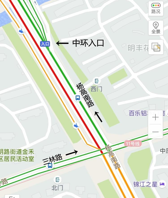 刘先生说的多次变道路段,是位于三林路北侧的由南向北的一段杨高南路。这段200米杨高南路的尽头,是杨高南路立交,中环线在此处设有上匝道。而刘先生每天正是从三林路由西向东,到三林路杨高南路路口后左拐,随后途经这段杨高南路,最后上中环。