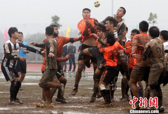 29日当天,位于来宾市广西科技师范学院内,来自各地的选手正在进行珍珠球、高脚竞速、板鞋竞速、抢花炮等比赛。在进行抢花炮比赛时,比赛双方的选手争先抢夺“花炮”,引得全场一阵阵欢声笑语。
