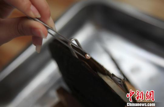 3月28日,90后“珍珠女”汪园红将蚌放置在“手术台”上,手术刀小心撬开隙缝,用铁夹固定,镊子小心伸入蚌体,夹出珍珠。 王剑 摄
