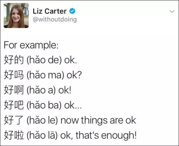 不过,国外有个网友@Liz Carter 厉害了,在推特上总结了一下怎么用英文表达中文“好的”。