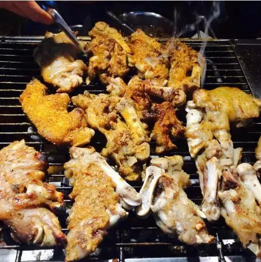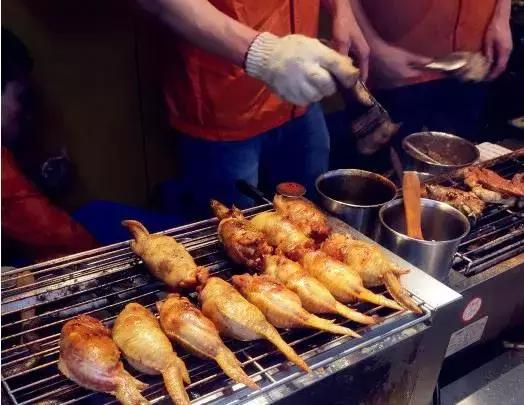 店不大,遵循的是“付钱拿蹄走人”的流程。烤架上源源不断地供应着猪蹄和鸡翅包饭,猪蹄的口味不少,香辣、孜然、蒜香等,总有一种能够满足你的胃。