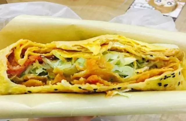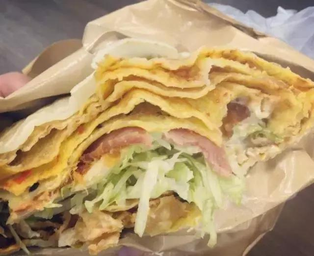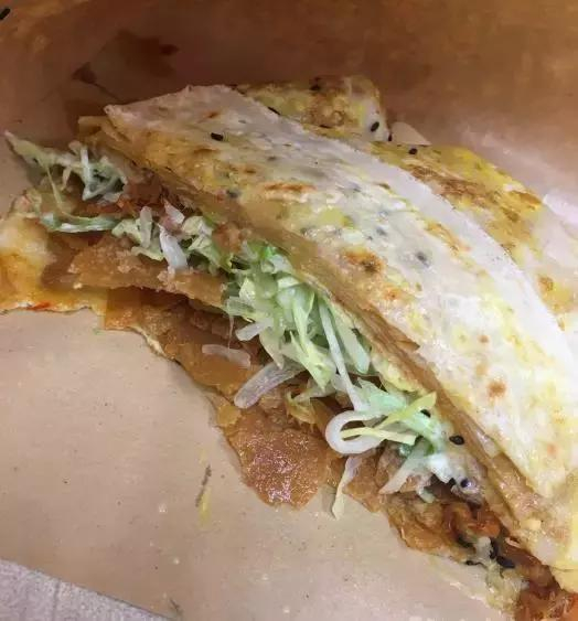 双蛋肉松培根和我脸一般大。面皮双面抹蛋液,上面还有黑芝麻,没有想象的那么油。第一口尝到的是韩国辣酱口味,然后是丘比特酱和脆脆的蔬菜丝以及脆饼的融合,越到后面越好吃,尤其是那个培根混合肉松,简直是绝配。