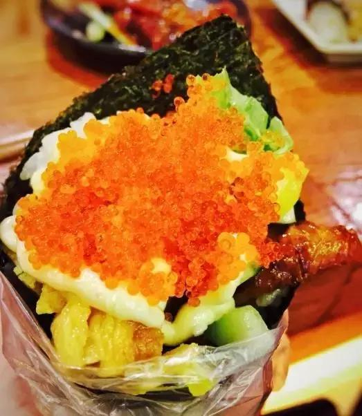 我最喜欢鳗鱼手卷了,鳗鱼藏在蟹子、青菜、沙拉酱下面,一口咬下去,鳗鱼的焦香、配菜的清爽加上白米的软糯,真是太好吃了!此款手卷真的非常适合拿着招摇过市。