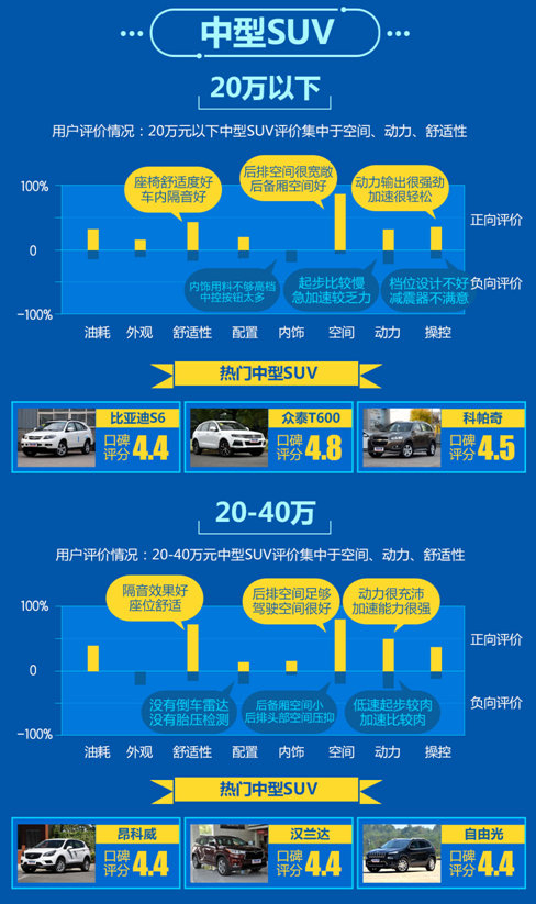数据显示,口碑车主在评价车辆时十分重视中型车的空间、动力、操控以及舒适性。各价位的中型车在车主眼里,前后排空间宽敞、提速快、指向性准、底盘扎实等优点实在是可圈可点,但各车辆也存在油耗偏高、胎噪大、后备箱空间不足以及低速起步肉等需要改进的地方。