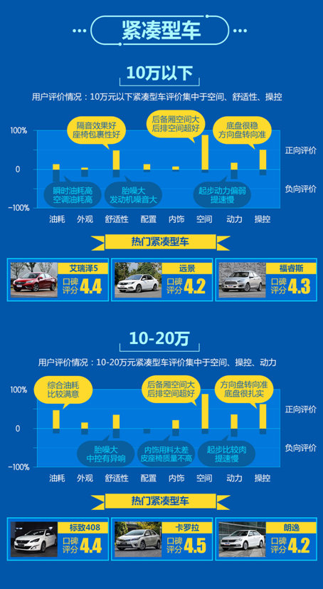 价位在10-20万元间的热门紧凑型车以标致408、卡罗拉、朗逸为代表。在空间、油耗、外观上,车主对三款车的评价趋同,但标致408在性价比、空间、动力、操控舒适性上,较其余两款车能带给车主更优的体验。