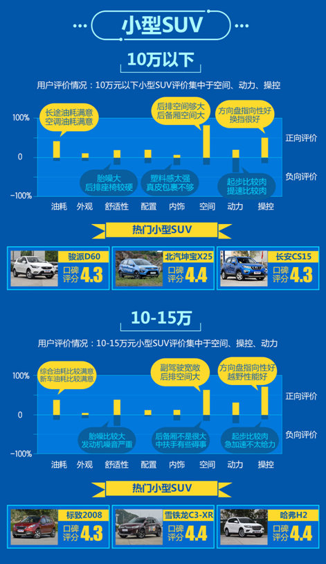 以10万元以下小型SUV来说,骏派D60、坤宝X25、长安CS15三款车型口碑数量最多,属于热门车型。在性价比、内饰、外观、舒适性方面,用户对三款车表现出较高的满意度。