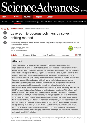 新闻网讯(通讯员 吴疆鄂)3月31号,《科学·进展》(Science Advances,《科学》子刊)发表了化学与化工学院谭必恩课题组最新研究成果:《溶剂编织层状微孔聚合物》(Layered Microporous Polymers by Solvent Knitting Method)。学院2011级博士生王绍磊为论文第一作者(目前在化学与化工学院继续从事博士后研究),谭必恩教授是论文的唯一通讯作者。这是我校首次以第一署名和通讯作者单位在该刊发表论文。