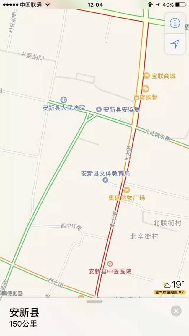 ▲中午12时左右安新县路况(红色表示拥堵)