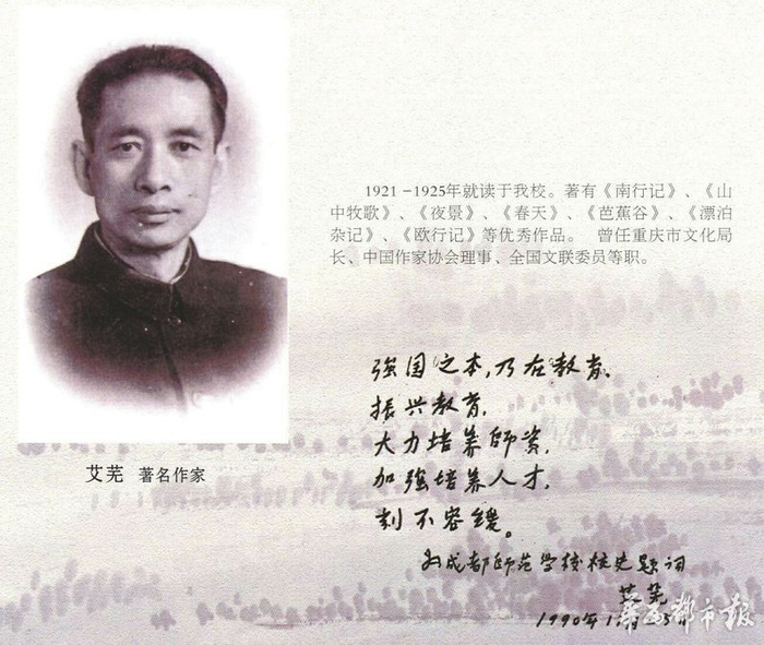 艾芜,原名汤道耕,新繁县清流乡(今新都区清流镇)人。艾芜家庭贫苦,小学未毕业。1921年考入免费的成都四川省立第一师范学校。因受《新青年》和创造社一些刊物的影响,对蔡元培《劳工神圣》的思想奉为圭臬。