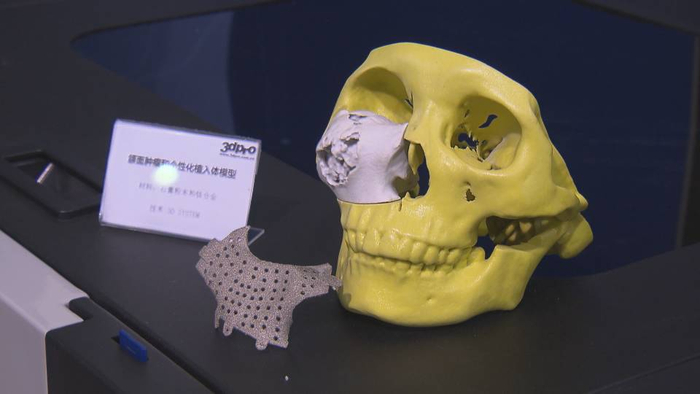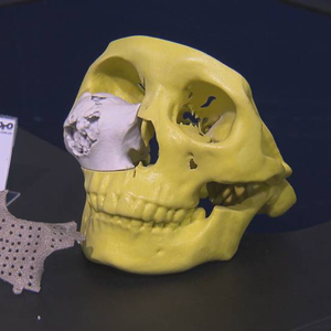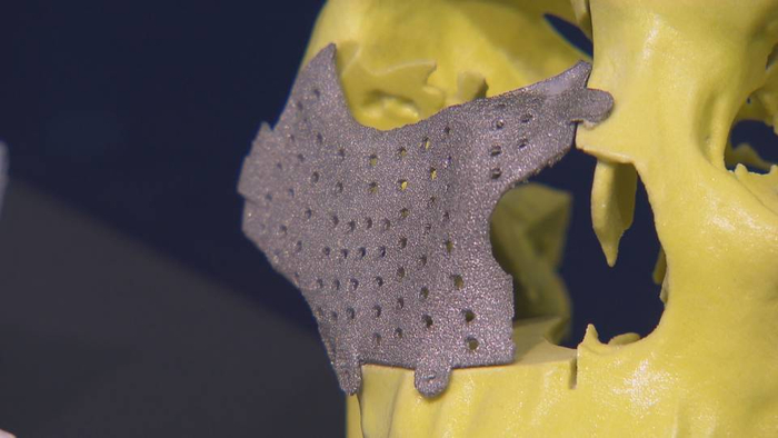 一个颌面肿瘤患者,颧骨附近被肿瘤细胞入侵。手术,在拿掉肿瘤的同时,也造成了面部塌陷,因为相应的骨头也都被拿掉了。不过,大家不用担心,这块钛合金的打印颧骨已经被植入患者面部。如今,手术过去近一年了,患者恢复良好。