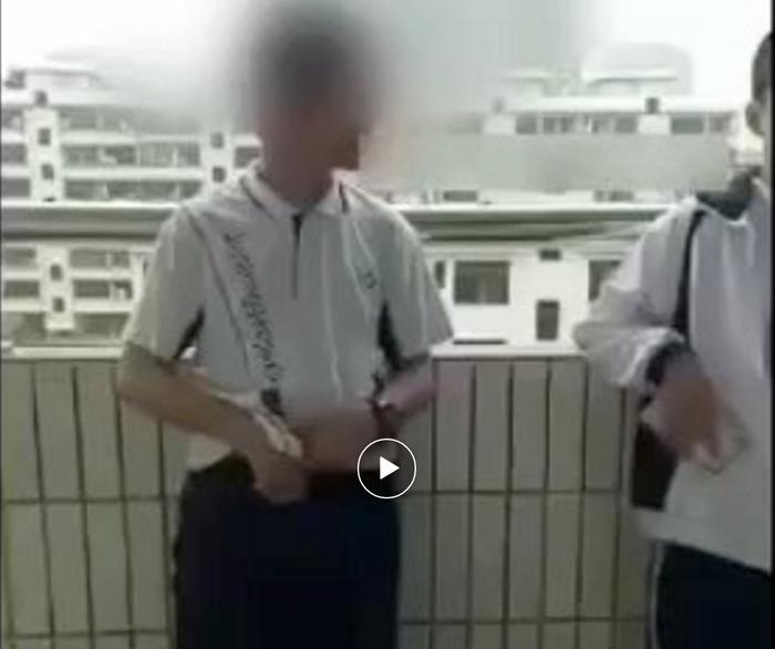 视频中,一名身穿校服的男生出现在镜头前,旁边还有一位没有露出脸的男生依靠在栏杆上。画外音疑似拍摄者,是一名满嘴脏话的女生,用粤语不断用脏话催促和辱骂该名男生,要求男生脱下裤子,嘈杂的背景音中也能够听到男生在旁插嘴助威。 最后,男生无奈之下,先是两头张望了一下,正对着镜头把裤子拉了下来。根据视频拍摄的环境,疑似是学校的走廊上,镜头晃动间还能看到不少围观的同学。
