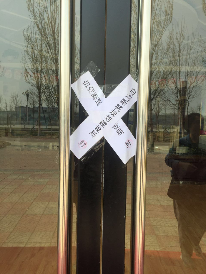 门口贴的白沟市新城规划建设局《致广大居民的一封公开信》中提到,近期不断收到举报,“反映部分房地产开发企业和商品房销售代理机构在未取得《商品房预售许可证》的情况下,擅自预售商品房,以各种星矢收取定金、预付款等性质的费用,使购房者承担了巨额的经济风险,购房者权益得不到法律保护,严重扰乱了市场秩序。”