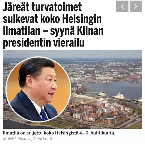习近平主席对芬兰的国事访问,芬兰政府高度重视,仅从当地强力安保措施就可见一斑。芬兰晚间新闻报报道,芬兰交通安全部门(Trafi)负责人HeikkiPorola指出,中国国家主席习近平将于4月4日到6日,对芬兰进行国事访问。访问期间,赫尔辛基区域实行空中交通管制。除了赫尔辛基万塔国际机场的大型客机不在管制内外,小型及私人飞机也禁止在赫尔辛基空中区域飞行。
