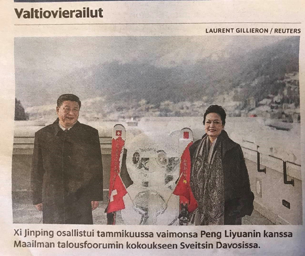 3月30日的赫尔辛基日报在国内版,提前6天预告了习近平主席携夫人彭丽媛访问芬兰的消息。并配有习近平主席和夫人彭丽媛一月份出席瑞士达沃斯论坛的照片。照片中间是一个冰制熊猫。熊猫的两个耳朵上分别张贴中国国旗和瑞士国旗。