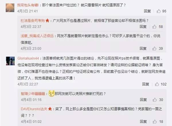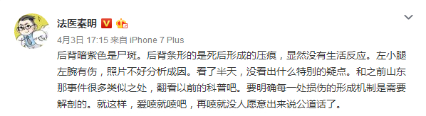 微博认证为“副主任法医师,《法医秦明》系列小说作者,果壳医药领域达人”的大V“法医秦明”在看了网上流传的死者照片后发布微博: