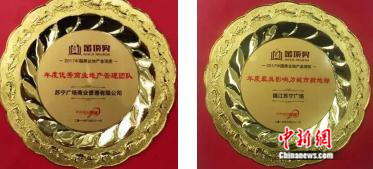 (图:苏宁广场商业管理有限公司和镇江苏宁广场分别荣获“年度优秀商业地产管理团队”奖”和“年度最具影响力城市新地标”)