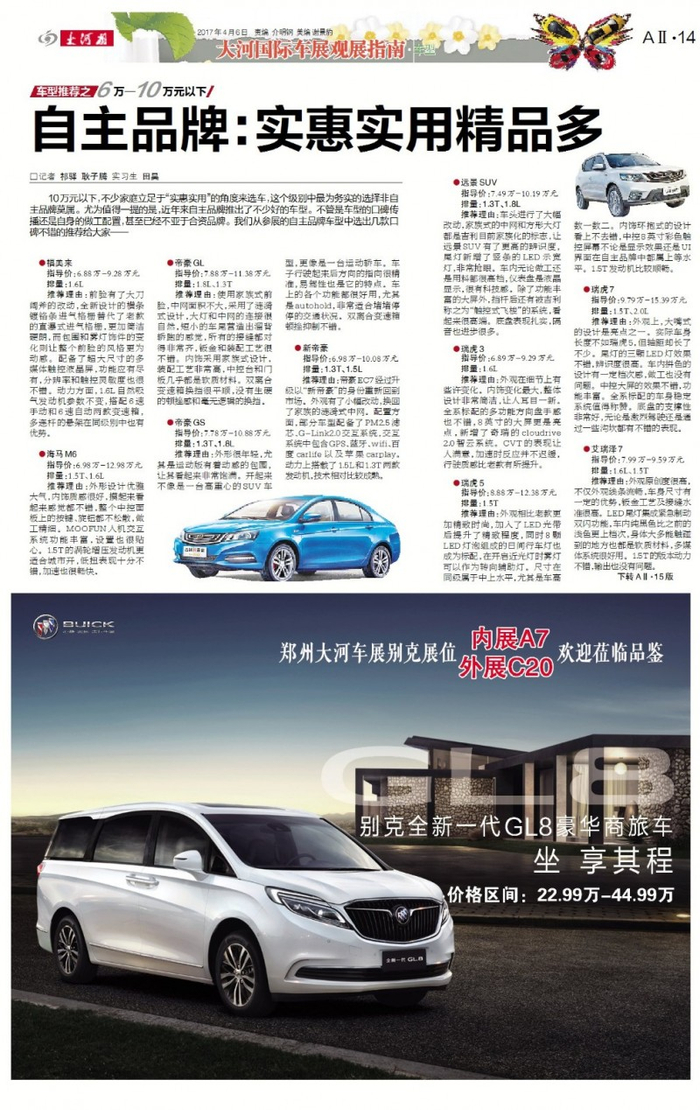 今日,大河报精心推出了32版全彩印大河车展特刊,呈现精彩车型,方便消费者选购,其中50万份采用铜版纸印刷(包括郑州市发行及现场发放部分),更加精美,也更适合保存。