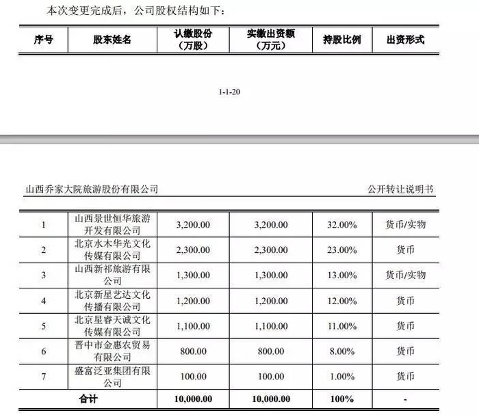 彼时,公司注册资本4000万元,分两期认缴。首次出资1200万元,上海盛富投资、祁县国资公司、乔家堡旅游分别认缴840万元、240万元、120万元,持股70%、20%和10%。